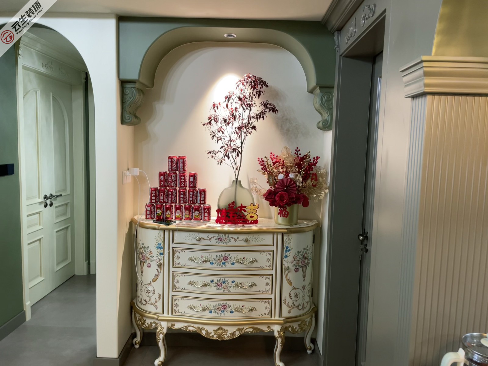 客厅的墙壁采用了墨绿色、奶白色为主色调,在空间吊顶设计上,做简约的雕花设计,细致的花纹石膏线,呈现出精致的空间效果,透着法式复古浓浓的浪漫气息,营造空间主次分明的秩序。壁炉里摆放着装饰画和摆件,为客厅空间增添了一抹唯美的色彩。当壁炉这一意象注入家中,美好从中迸发,无形的生活之光在家中洋洋洒洒地蔓延着。
